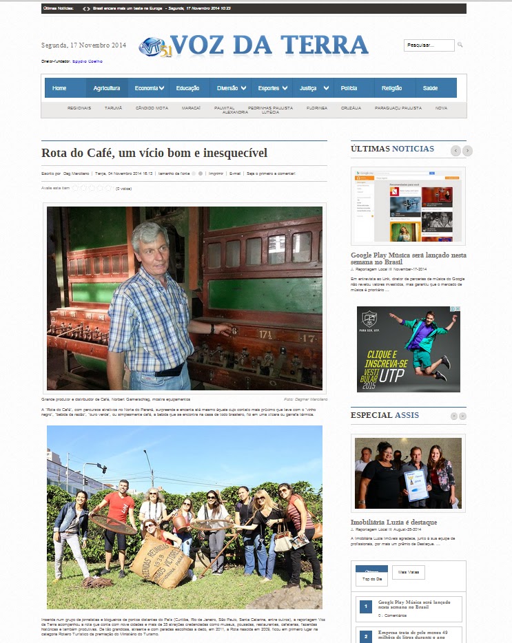 Matéria sobre tour na Rota do Café no portal do jornal Voz da Terra